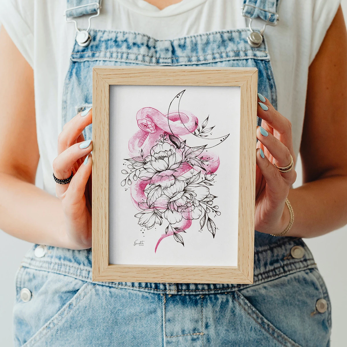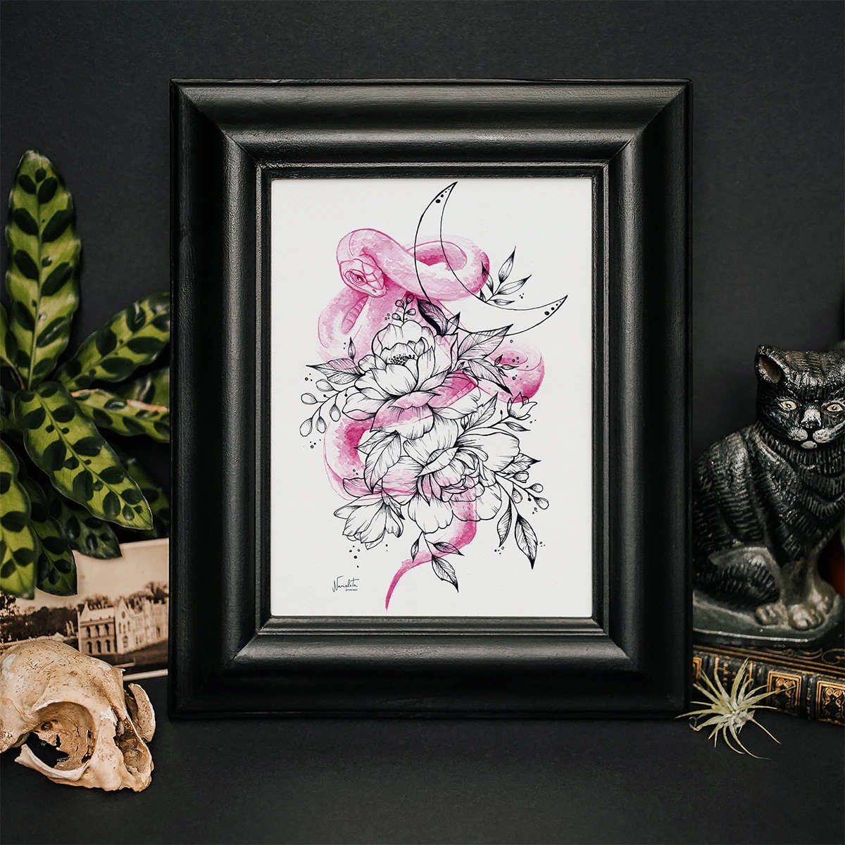 Sumérgete en la fusión de la naturaleza y lo místico con “Serpent flos”. Esta obra en tinta y acuarela destaca por sus delicados trazos y suaves tonos rosados, que representan flores exuberantes, una serpiente enroscada y una luna creciente. Perfecta para quienes buscan añadir un toque de elegancia y misterio a su espacio.