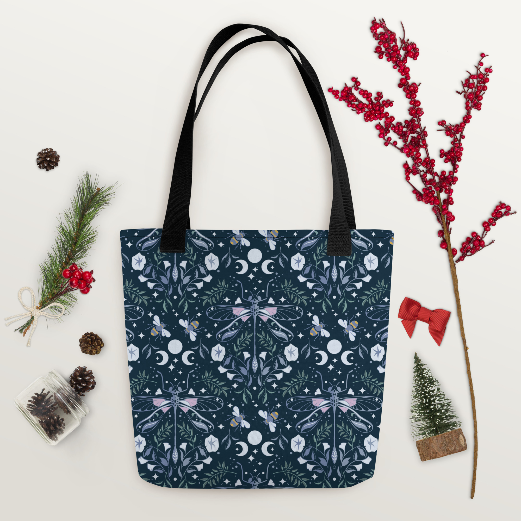 Bolso de asas totalmente impreso y Print-on-demand de mi patrón de Libélula nocturna, perfecto para amantes de la estética witchy o gótica.