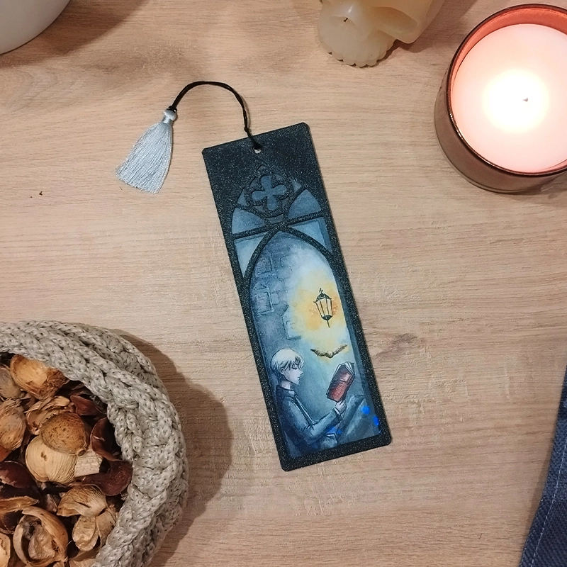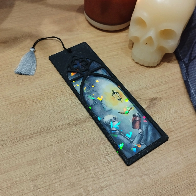 Marcapáginas ilustrado con acabado vidriera enmarcado en una ventana de inspiración élfica impresa en filamento 3D.