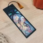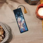 Marcapáginas ilustrado con acabado vidriera enmarcado en una ventana de inspiración élfica impresa en filamento 3D.