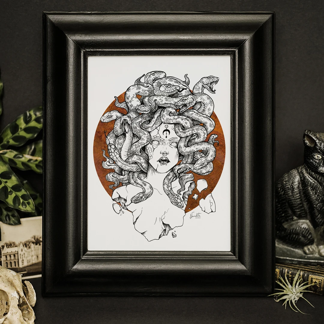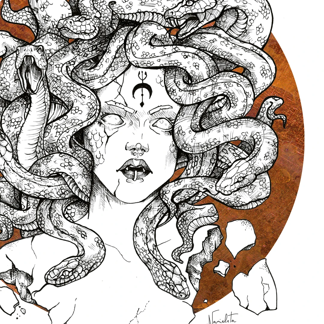 Ilustración de la estatua rota de Medusa. Perfecta para los amantes de la mitología y el arte oscuro, captura la esencia de este icónico personaje con un estilo detallado y único. Ideal para decorar cualquier espacio o como regalo para coleccionistas. ¡Cómprala ahora y añade un toque de misterio y encanto mitológico a tu hogar!