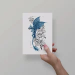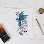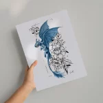Ilustración inspirada en Desdentado, el furia nocturna, el dragón mítico de “Cómo entrenar a tu dragón” enmarcadas por flores dibujadas en linea.  Esta ilustración combina acuarelas y tinta, recordando a un diseño de tatuaje donde cada estilo complementa al otro.