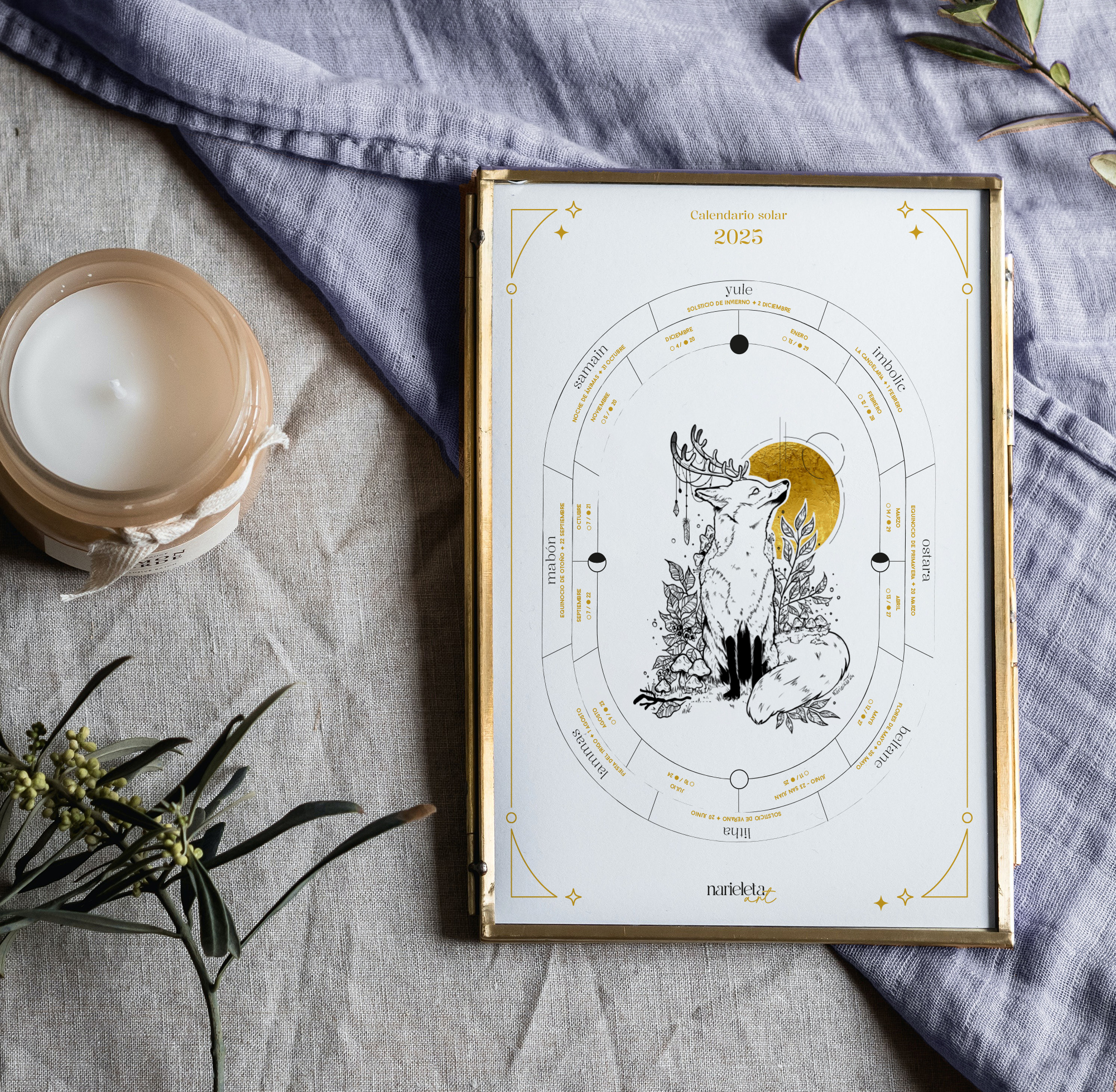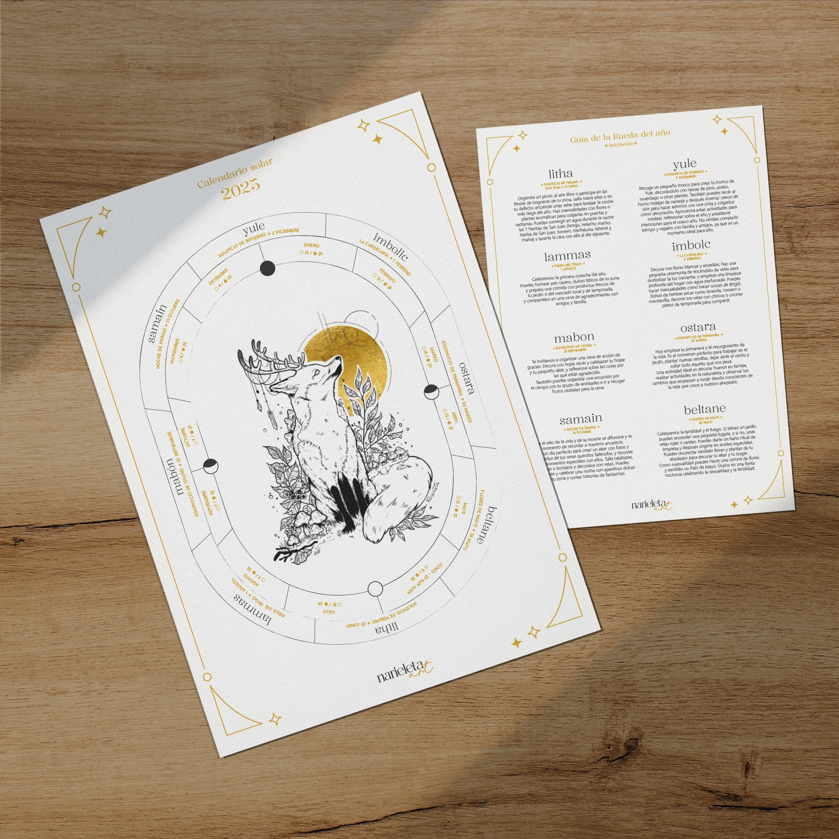 Decorado con una ilustración exclusiva de un zorro astado rodeado de elementos naturales y detalles dorados, este calendario combina funcionalidad y espiritualidad, ideal para planificar tus rituales y celebraciones. Perfecto para wiccanos, druidas y amantes de las tradiciones paganas.