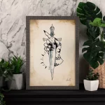 Ilustración de inspiración witchy de una mano tatuada sujetando una daga ritual. Representando la lucha y el poder en nuestras manos.
