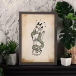 Ilustración de inspiración witchy de una mano tatuada sujetando una serpiente Representando la sabiduría, la longevidad y la inmortalidad.
